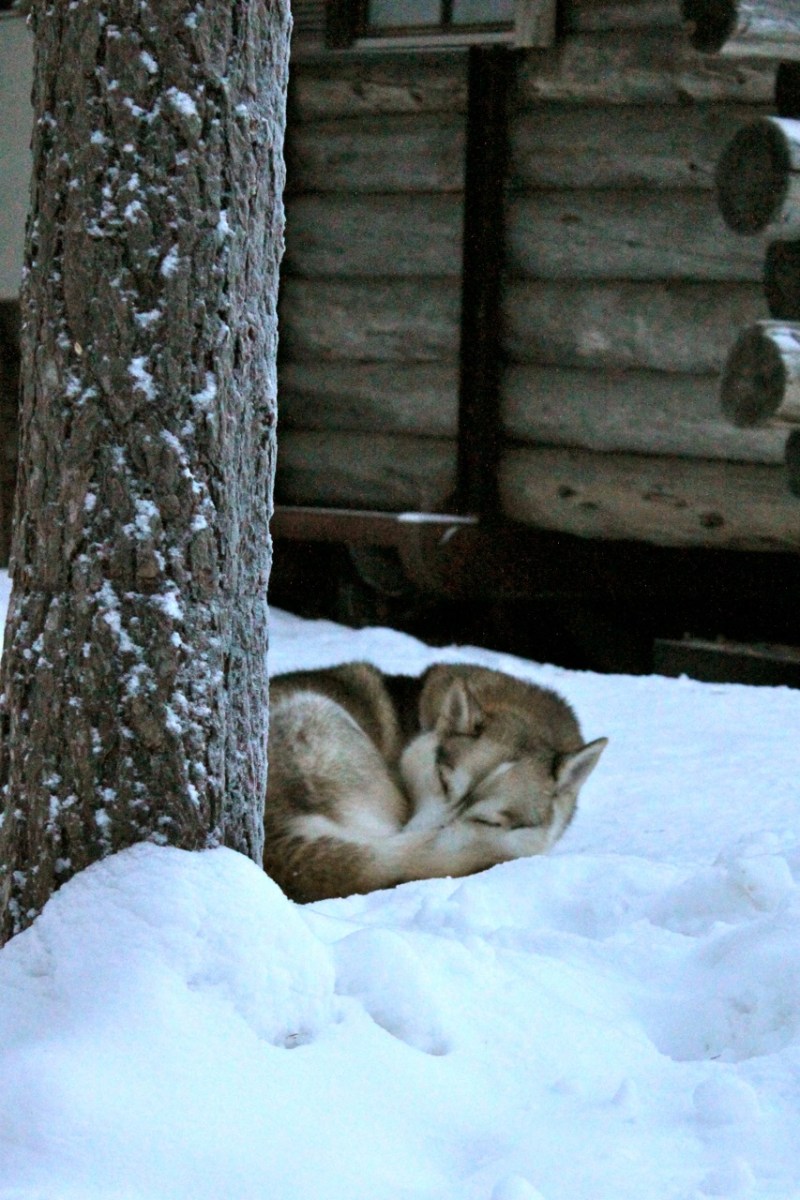 husky sleeping Published December 29, 2013 at 853 × 1280 in Dog Sledding with Huskies & Seeing the Northern Lights in Lapland ← Previous Next → I saw this husky sleeping so peacefully in the snow when we first arrived for our sled ride.